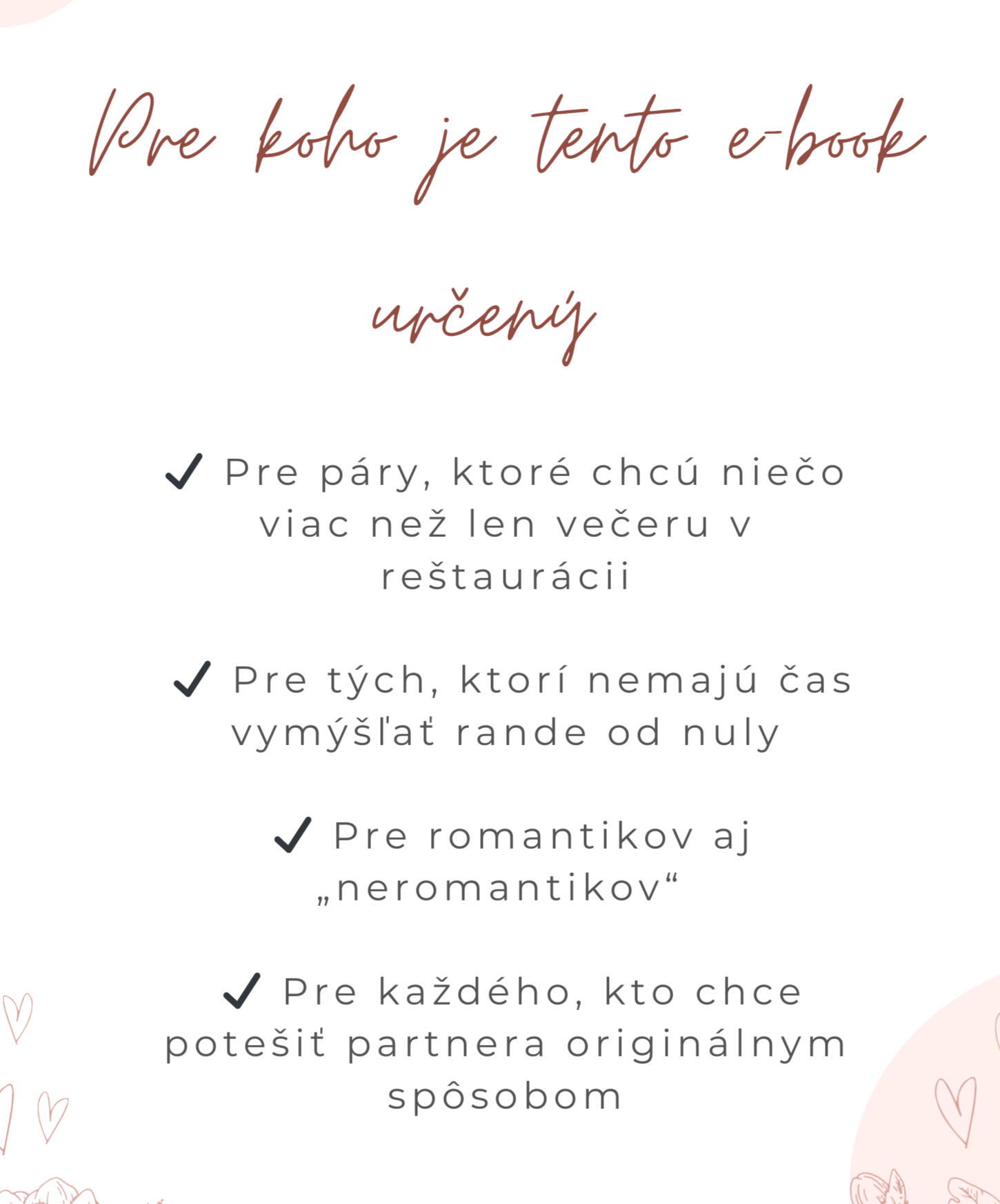 Balík obsahuje: e-book plný nápadov na najlepšie valentínske rande, praktický checklist, jednoduchú prípravu krok za krokom a zoznam romantických viet, ktoré povedia viac než darček.
